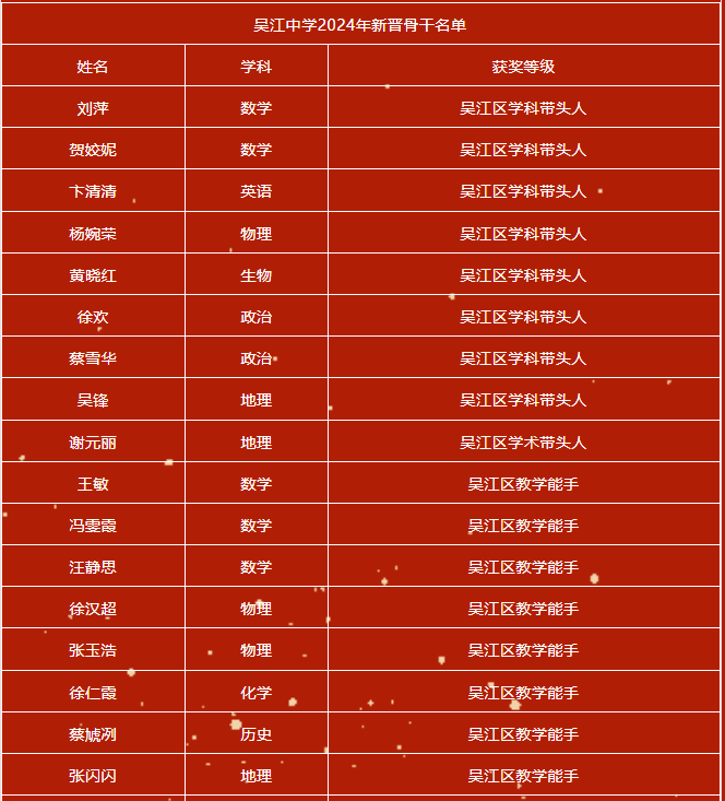 知识是笔,教育是砚。有好的教师,才有好的教育。吴江中学的教师一直以谦逊严谨、精益求精的治学态度提升自身专业技能,以循循善诱、诲人不倦的教学态度引导学生释疑解惑。我校也一直致力于青年骨干教师的培养,高素质的教师队伍是推进素质教育,促进教育公平,提高教育质量的重要保证。